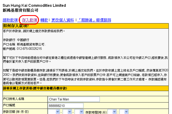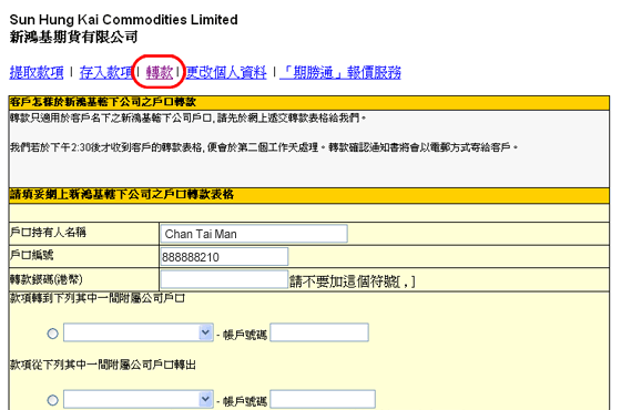 如需轉款,按「轉款」,輸入資料及買賣密碼然後按「遞交」。