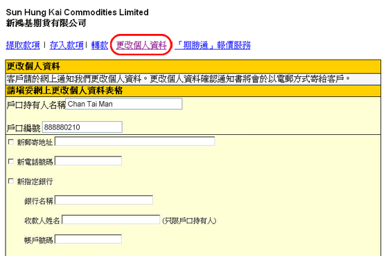 如需更改個人資料,按「更改個人資料」,輸入資料及買賣密碼然後按「遞交」。