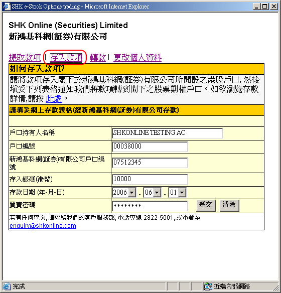 請先將款項存入閣下於新鴻基科網(証券)有限公司所開設之港股帳戶,然後按「存入款項」,輸入資