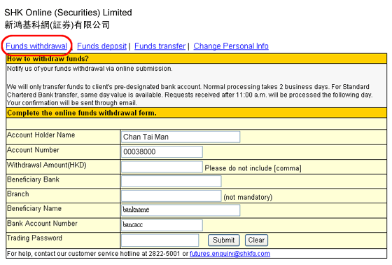 To withdraw funds, click "Funds withdrawal", enter details and your Trading Password, then click "Submit".