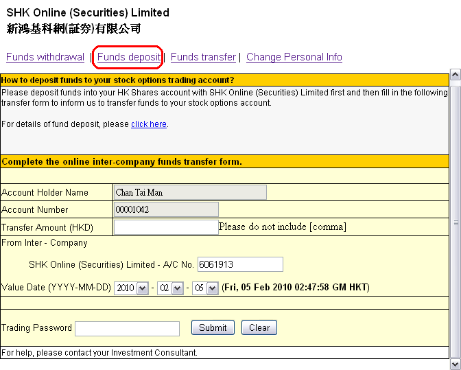 When deposit funds via Bank of China's ATM, click "Funds deposit", enter details and your Trading Password, then click "Submit".