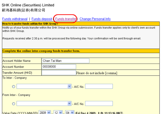 To transfer funds, click "Funds transfer", enter details and your Trading Password, then click "Submit".