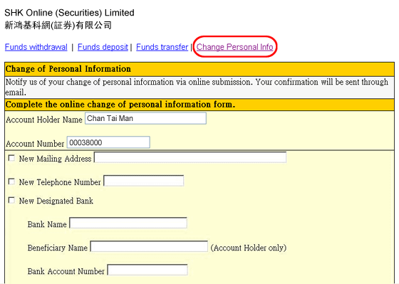 To change your personal information, click "Change Personal Info", enter details and your Trading Password, then click "Submit".
