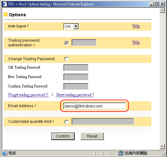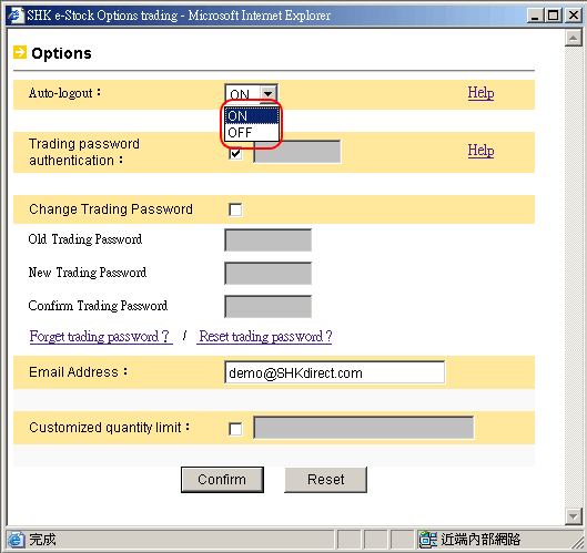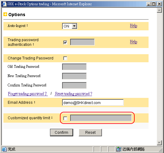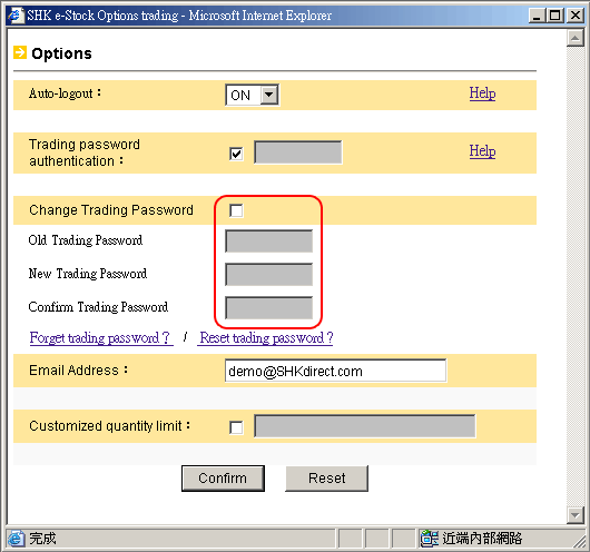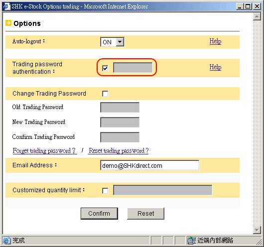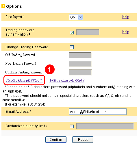 2. If you do not want to enter your trading password everytime when you place an order, please uncheck the box. 3. Click "Confirm" button at the bottom to effect the changes.