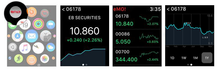 eMO! for Apple Watch lets you check any of the stocks in the Watch List from your wrist. If you are using real-time quote on your iPhone, you will also be able to get real-time quote on your Apple Watch(2).