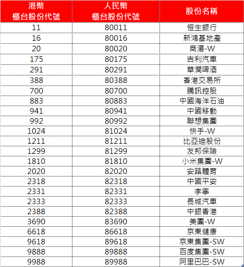 目前,共有24隻在港幣及人民幣櫃台上市的證券(如下),名單將不時更新,請按此前往港交所網頁參閱最新的雙櫃台證券名單。