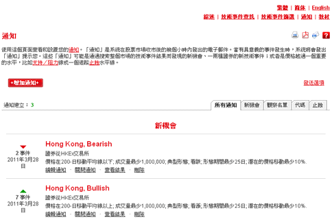 使用「通知(提示)」可查看和設置您的提示準則。於重要事件發生後並在股票市場收市後,您會收到電子郵件通知。這些「通知(提示)」可能是利用「技術事件」搜索後而發現的新投資機會、適用於單一或多種證券、或者是價格穿越一個重要門檻,比如支撐/阻力線或一個追蹤止蝕水平線。